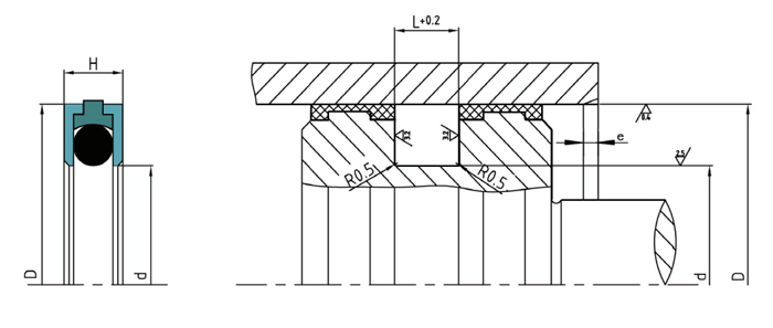 TGDA组合密封-GGDA活塞杆用密封件-GGDA组合密封圈 1.标准材料 密封体:填充聚四氟乙烯F-PTFE 弹性体:丁腈橡胶NBR L 环:聚甲醛POM或尼龙PA  2.应用范围 TGDA由一个密封环、两个L型POM(直径Ф400 mm以上用PA)支撑环和一个施力的O形圈组成活塞杆组合密封。支撑环起支撑和引导作用,以确保紧密的密封环境。密封环依靠O圈的施力紧压活塞杆,提供密封作用。可在矿物油,水基润滑液、改性水基润滑液和其他液体中使用。 设计选用时可参考Hunger公司GGDA系列标准。 3.特性及优点 1.安装容易 2.高耐磨 3.能够抗挤出并无粘滑现象。